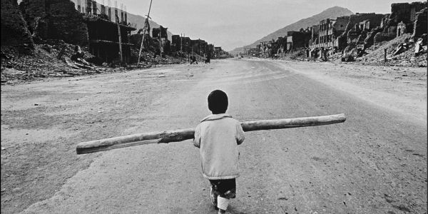 Kaboul, décembre 1994, un enfant transporte du bois sur l’avenue Judde © Laurent Van der Stockt / Gamma