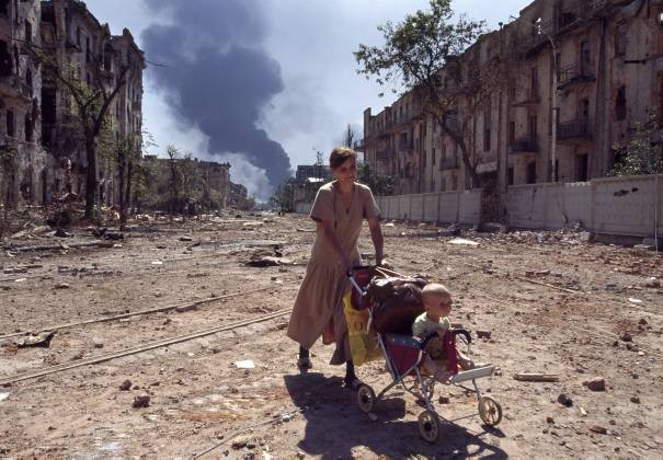 Une famille et son enfant, dans la ville de Grozny, ravagée par la guerre © Laurent Van der Stockt / UNHCR (Agence de Nations Unies pour le réfugiés)