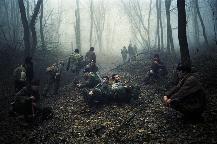 Tchétchénie, décembre 1999. Combattants tchétchènes en chemin pour Grozny. Ils traverseront les lignes de front russes devant l’armée pour entrer dans la ville et la défendre. © Laurent Van der Stockt / Gamma