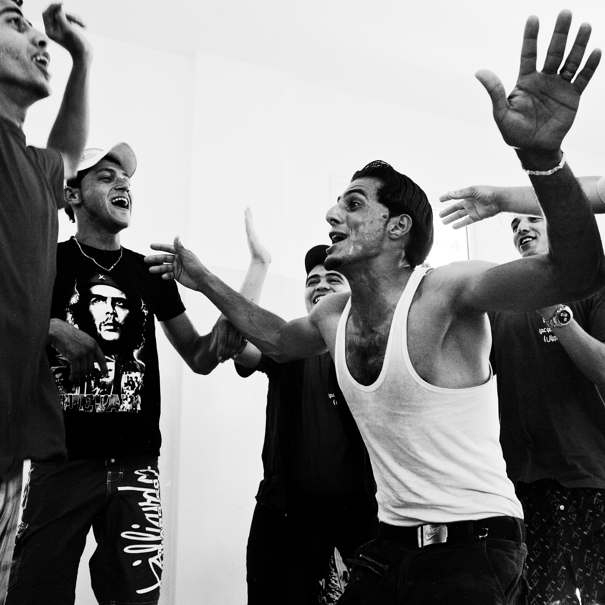 Ces jeunes participent à projet de résistance pacifique organisé par la plateforme d’ONG OPGAI. Ils graffent sur les murs de la rue principale du camp des messages ou des images politiques. En attendant que la température baisse, ils se détendent et plaisantent, et tout à coup c’est une explosion d’énergie et ils mettent à danser et à rire. © Yann Renoult