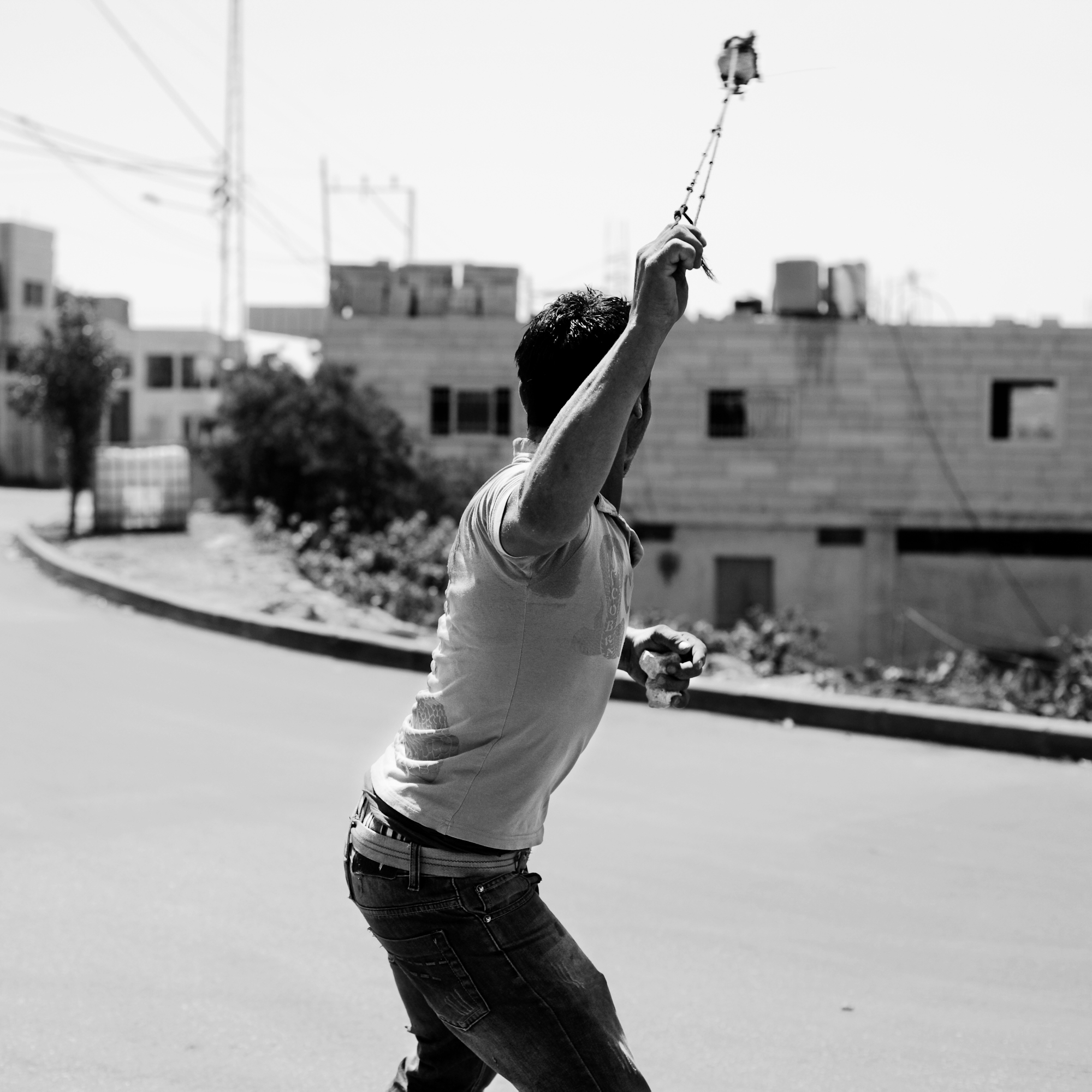 Beit Ummar – une manifestation contre les violences de l’armée s’envenime après que des soldats aient piétiné un drapeau et bousculé des enfants. Les plus sages ne parviennent pas à contrôler la rage des jeunes, qui lancent des pierres sur les soldats lourdement armés. Plus qu’une armée, ces jets de pierre signifient aux soldats qu’ils ne sont pas les bienvenus, et sont pour les jeunes un exutoire à leur colère. © Yann Renoult