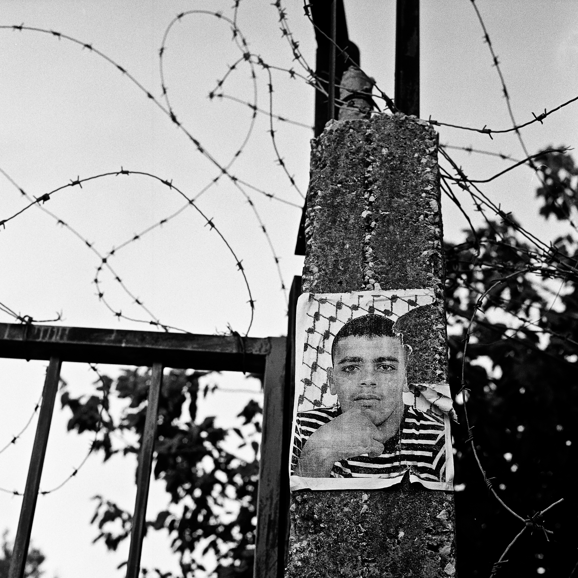 Bethlehem – Portrait d’un martyr sur un mur. Sur la colline d’en face, séparée par des barbelés, des grilles et une route, une colonie. Qui sait quand et pourquoi ce jeune homme est mort ? © Yann Renoult