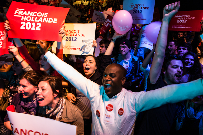 Dans la salle de concert du Transbordeur, où se sont rassemblés les sympathisants de Francois Hollande, lors de l’annonce des résultats, le 6 mai 2012. Citoyens, victoire, gauche, élection, Hollande, foule, joie, jeunesse, mémoire