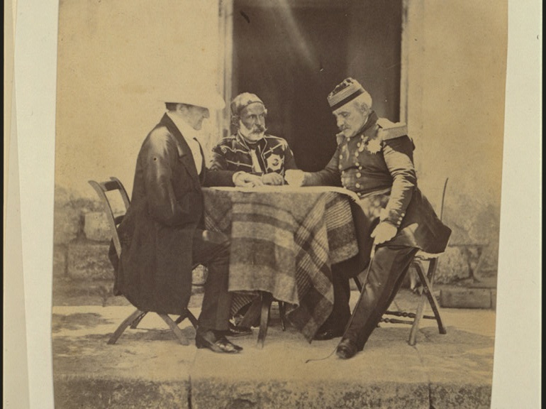 Guerre de Crimée : un conseil de guerre, dans les quartiers de lord Raglan (à gauche), avec le maréchal Pélissier (à droite) et le général ottoman Omer Pacha, au matin de la prise du mamelon vert, un lieu fortifié. © Roger Fenton – Library of Congress.